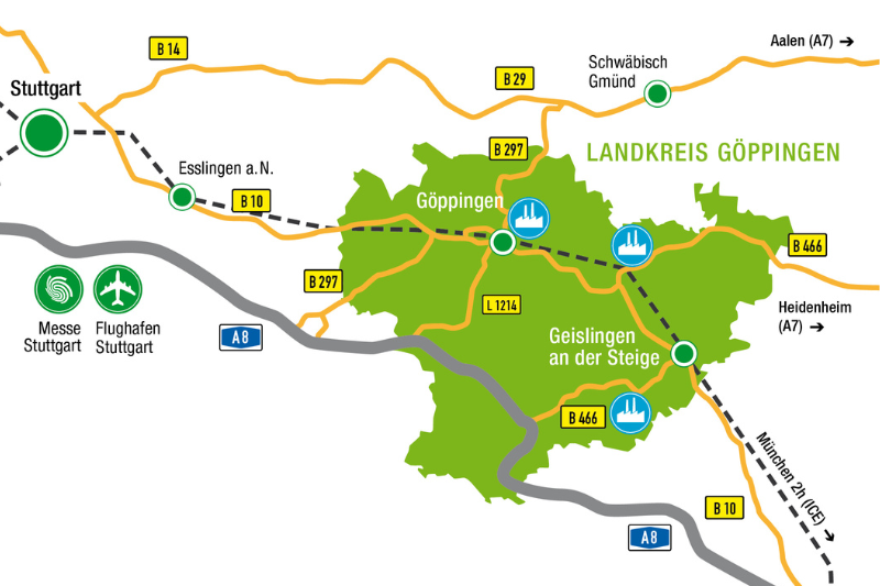 Als Teil der prosperierenden Metropolregion Stuttgart hat der Landkreis Göppingen einiges zu bieten: Hervorragende wirtschaftliche Rahmenbedingungen treffen hier auf eine besonders reizvolle Landschaft mit hohem Freizeitwert. Das macht den Landkreis zum attraktiven Wirtschaftsstandort, der neben einem guten wirtschaftlichen Klima auch ein hohes Maß an Lebensqualität bietet.