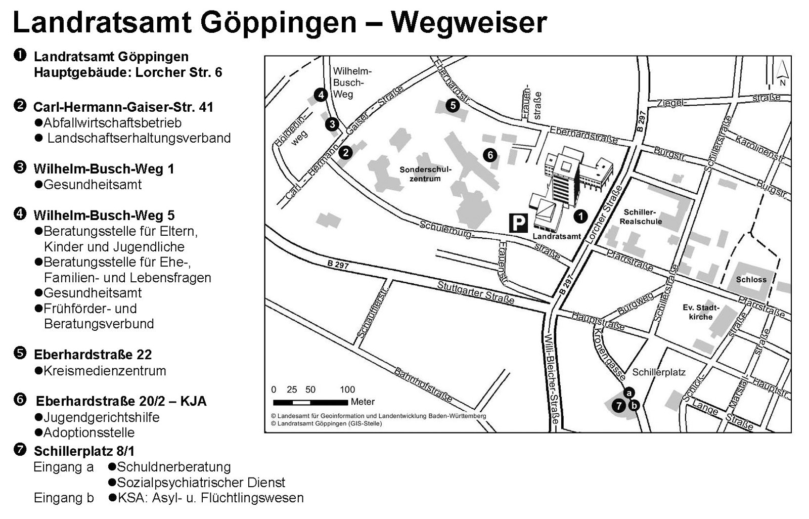 Das Landratsamt Göppingen hat seinen Hauptsitz in der Stadt Göppingen, etwa 45 km von Stuttgart und 65 km von Ulm entfernt. Die Dienststellen und Einrichtungen des Landkreises befinden sich in Göppingen und Geislingen an der Steige.