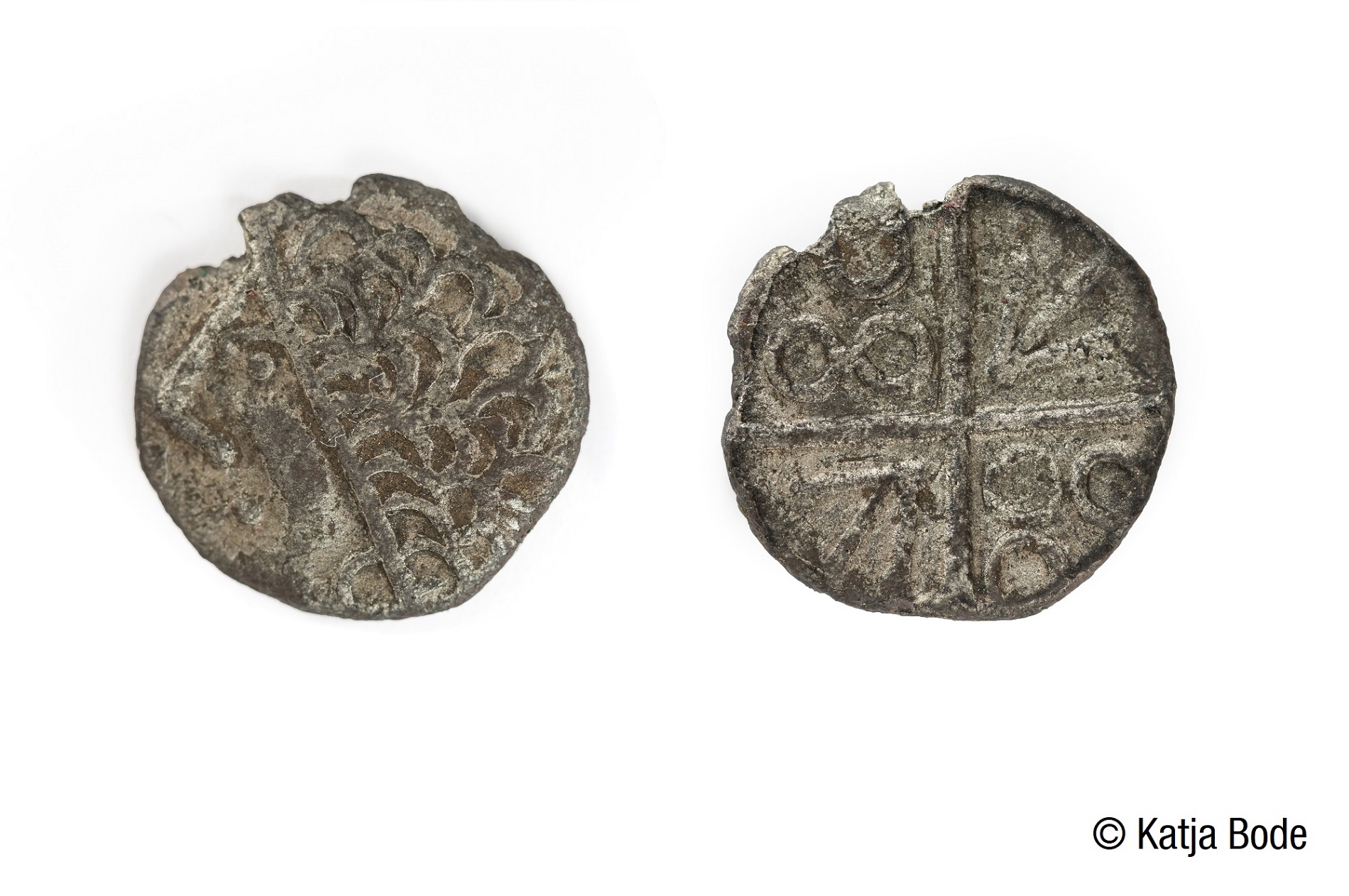 Außerdem waren im süddeutschen Raum zahlreiche Silber- und Goldmünzen in Gebrauch, die in Zentralsiedlungen wie dem Oppidum von Manching in Bayern oder auch dem Heidengraben-Oppidum auf der Uracher Alb geprägt wurden. Der hiesige Fund stammt ebenfalls aus dem spätkeltischen Regionalzentrum zwischen Gingen und Süßen. Es handelt sich um eine silberne Kreuzmünze vom Typ Dühren, die seit 150 v. Chr. im Umlauf war. Der möglicherweise in Bayern geprägte Quinar zeigt auf seiner Vorderseite einen nach links blickenden Kopf mit Locken – also wiederum ein Motiv, das einem antiken Herrscherkopf nachempfunden wurde. Auf der Rückseite ist ein Kreuz erkennbar, in dessen Winkeln zwei Pfeile und zwei Kreisgruppen jeweils gegenüberliegend angeordnet sind. Neben den Münzen ist unter den Funden ein 2,7 cm großer stilisierter Stierkopf hervorzuheben. Unklar ist, ob er Teil eines Gürtelhakens war.